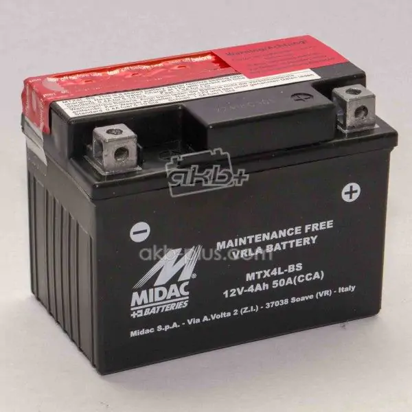 Аккумулятор MIDAC MOTO MTX4L-BS (YTX4L-BS) – надежный AGM аккумулятор 12V, емкостью 4Ah и пусковым током 50A. Идеален для мототехники, квадроциклов, гидроциклов и снегоходов. Благодаря технологии AGM, он устойчив к вибрациям и не требует обслуживания. Расположение плюсовой клеммы: справа. Компактные размеры (113 x 70 x 86 мм) позволяют легко установить его на большинство моделей. Обеспечивает уверенный старт двигателя.