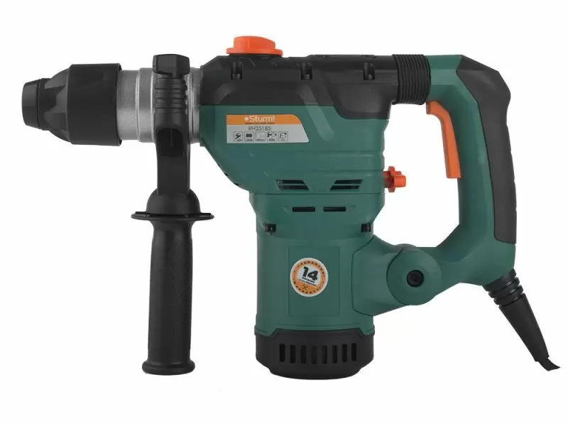 Перфоратор Sturm RH25185 представляет собой современный электроинструмент, с высокой мощностью и надежностью. Для работы его подключают к обычной однофазовой сети с напряжением в 220В. Рабочих режимов у него несколько и с ним можно сверлить отверстия, сверлить с ударом и производить долбление таких материалов как: камень, кирпич, бетон, дерево, металл. Также, с инструментом делают штробы для прокладывания в стене скрытых коммуникационных сетей, кабелей (под электропроводку или трубы). Контролировать параметры получаемого отверстия в нем можно при помощи глубиномера. Сетевой кабель с длинной в два метра дает возможность пользователю легко перемещаться на строительной площадке или в квартире. Система крепления бура SDS+ дает возможность заменять оснастку в аппарате, без потери рабочего времени.